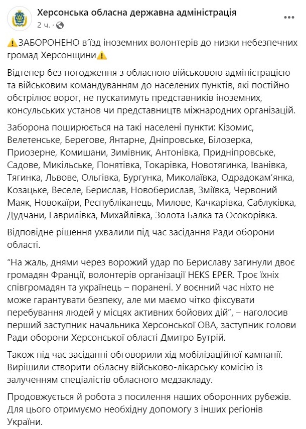 Власти Херсонской области запретили въезд иностранных волонтеров в ряд населенных пунктов региона