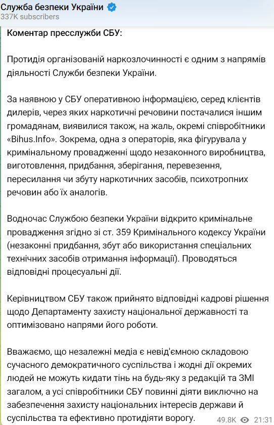 "По имеющейся в СБУ оперативной информации, среди клиентов дилеров, по которым наркотические вещества поставлялись другим гражданам, оказались также, к сожалению, отдельные сотрудники Bihus.Info. В частности, один из операторов, фигурировавший в уголовном производстве по незаконному производству, изготовлению, приобретению, хранению, перевозке, пересылке или сбыту наркотических средств, психотропных веществ или их аналогов", – говорится в заявлении.