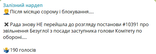 "Рада снова не перешла к рассмотрению постановления №10391 об увольнении Безуглой с должности заместителя председателя комитета по обороне…" - написал он в своем телеграм-канале.