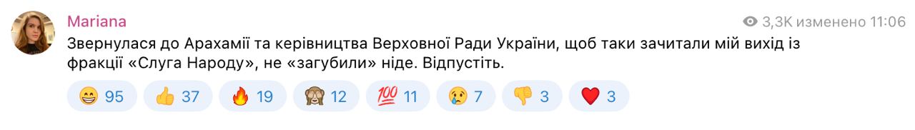 А 12 января Марьяна Безуглая сообщила, что ее заявления на выход из партии и фракции "Слуги народа" "официально приняли".