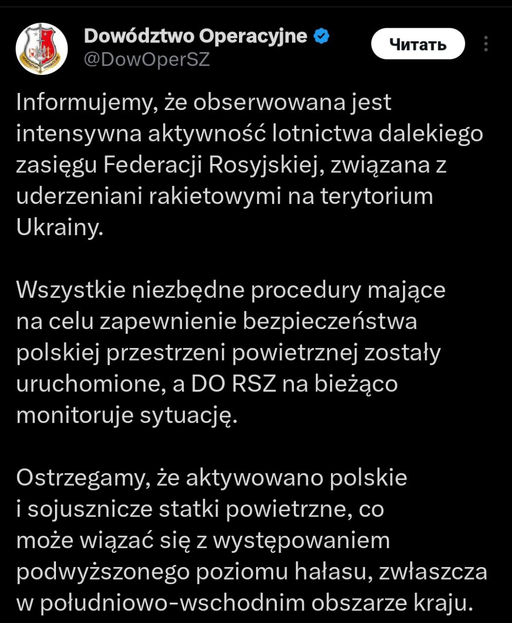 Сообщается, что из-за интенсивной деятельности дальней авиации РФ, связанной с ракетными ударами по Украине, в Польше были активизированы все необходимые процедуры для обеспечения безопасности воздушного пространства. Руководство страны следит за ситуацией и принимает соответствующие меры.