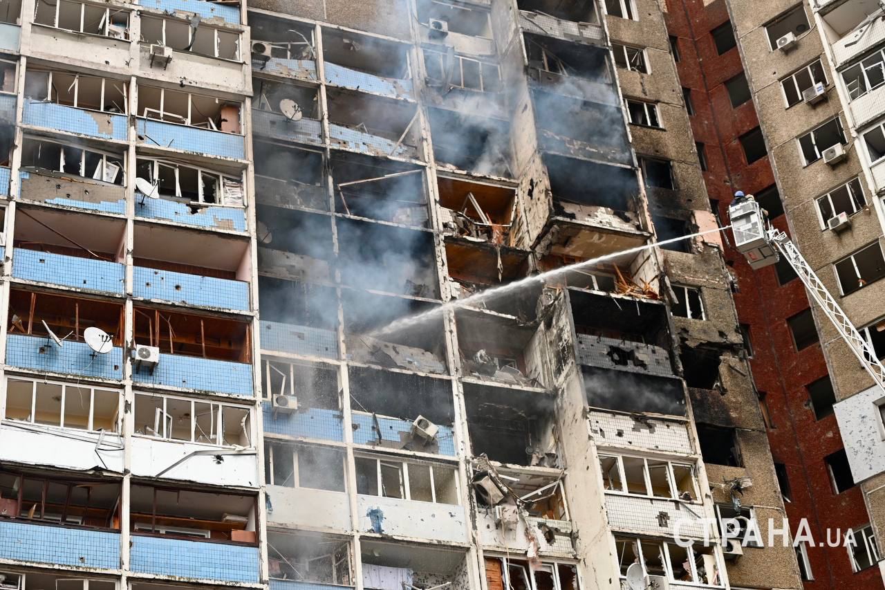 Кадры многоэтажного дома в Голосеевском районе Киева со стороны прилета. Было разрушено несколько балконных перекрытий. Повреждено минимум семь этажей.