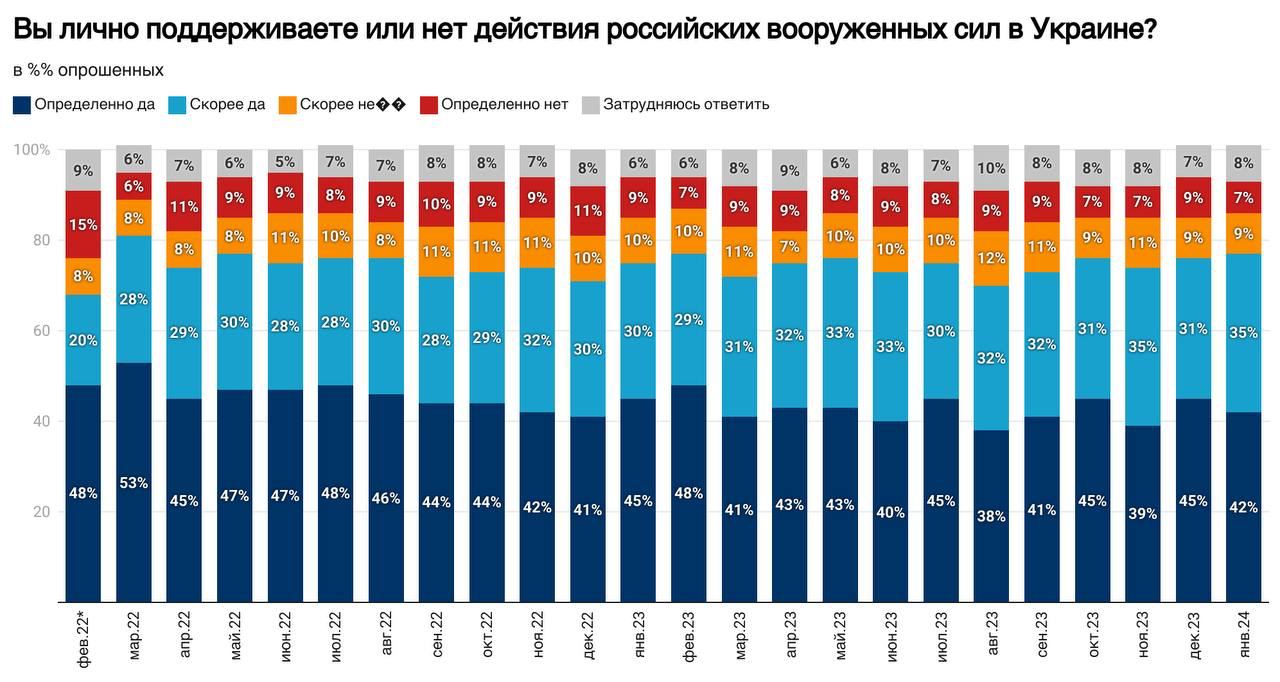 В январе 42% опрошенных россиян заявили, что определенно поддерживают "действия российских вооруженных сил в Украине", еще 35% - скорее да, 9% - скорее нет, 7% - определенно нет, 8% затруднились ответить.