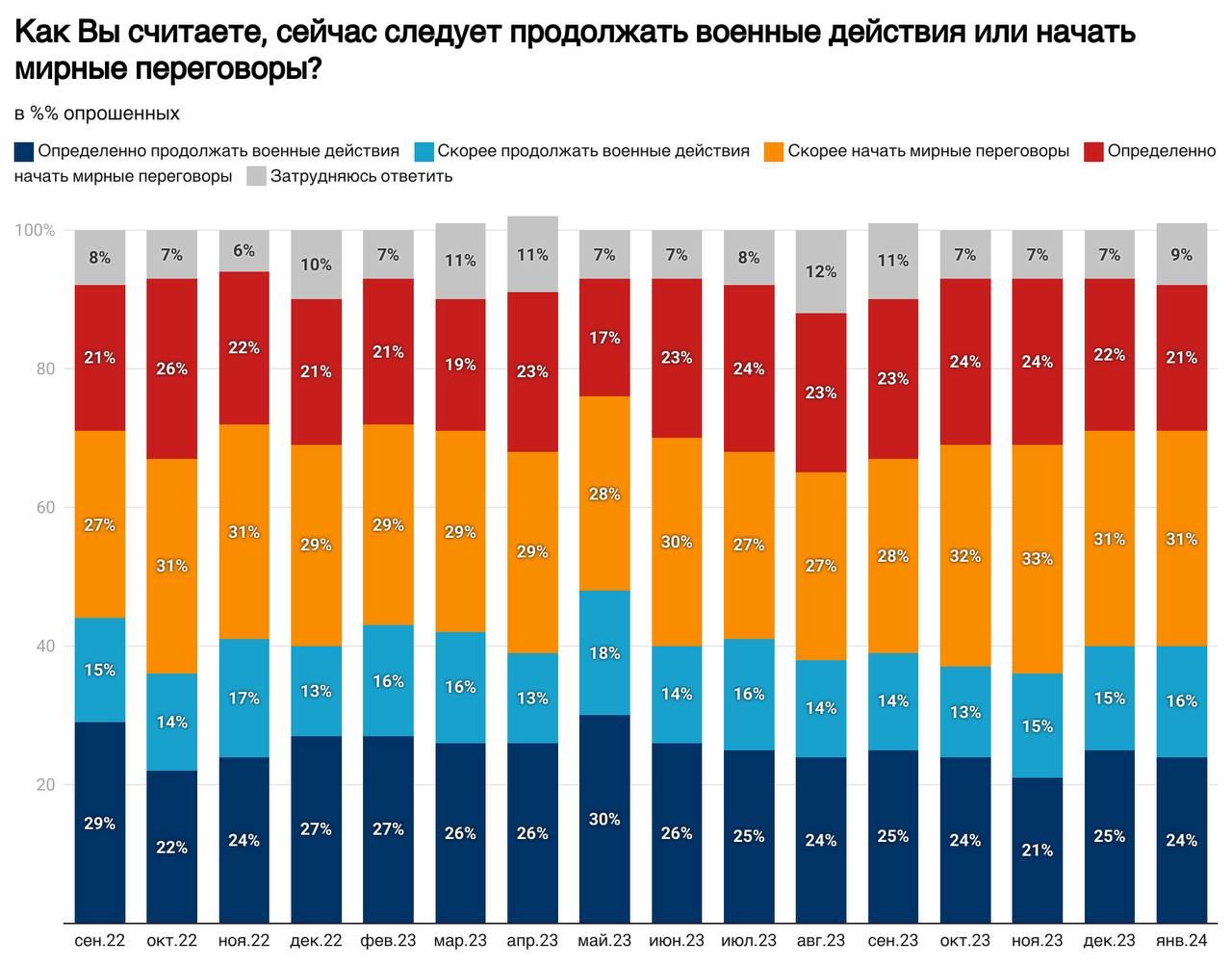 Одновременно с этим большинство выступает за начало мирных переговоров: 31% - скорее за переговоры, 21% - точно за, 24% - за продолжение войны, 16% - скорее за войну.