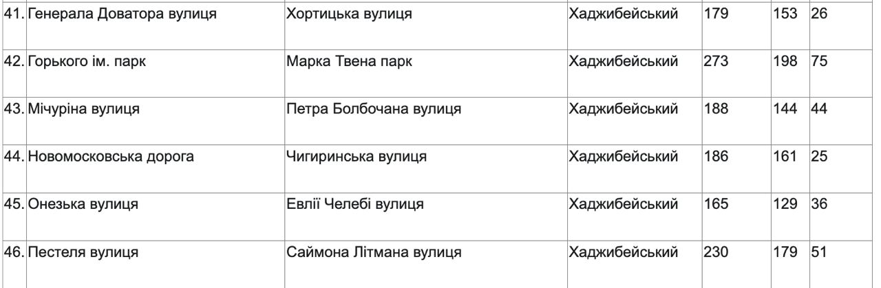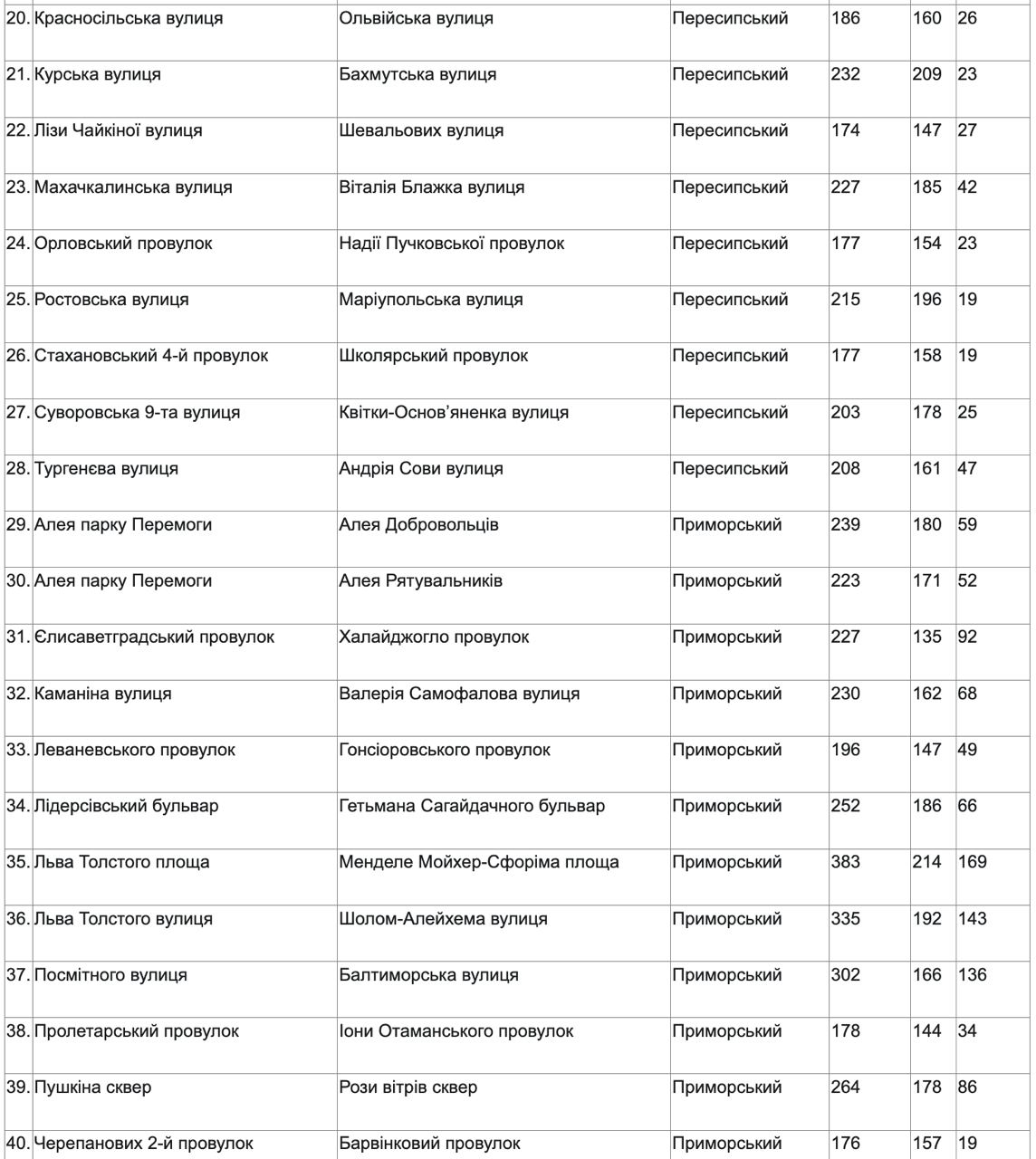 Елисаветградский переулок - 135 против 92. Улица Посмитного - 166 против 136. Сквер Пушкина - 178 против 86. Парк Горького - 198 против 75.