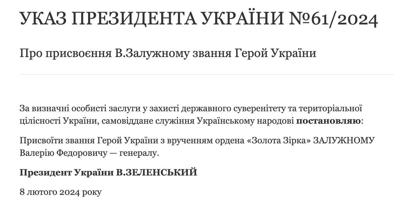 Указ датирован вчерашним числом. То есть, он вышел в тот же день, что и указ об отставке Залужного с поста главкома ВСУ.