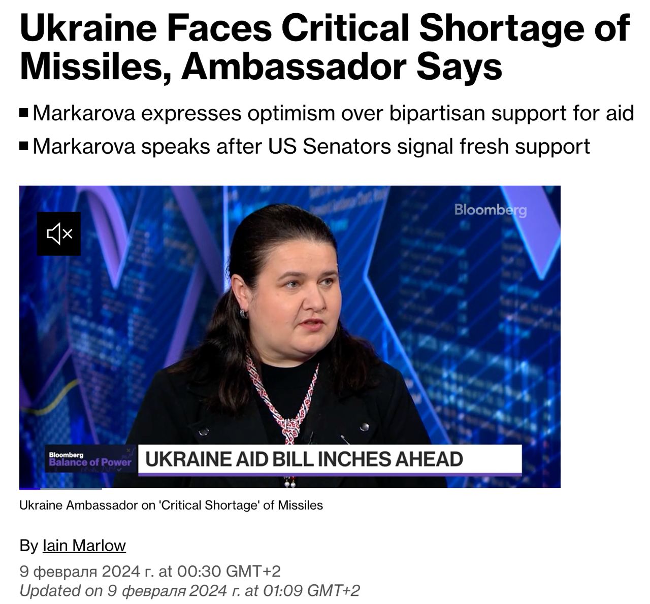 13.48 Украина сталкивается с критической нехваткой ракет для систем ПВО, заявила Bloomberg украинский посол в США Маркарова.