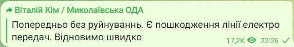 22.30 Глава Николаевской области Ким подтвердил взрывы в регионе и повреждение линии электропередач.