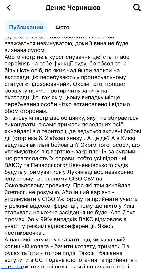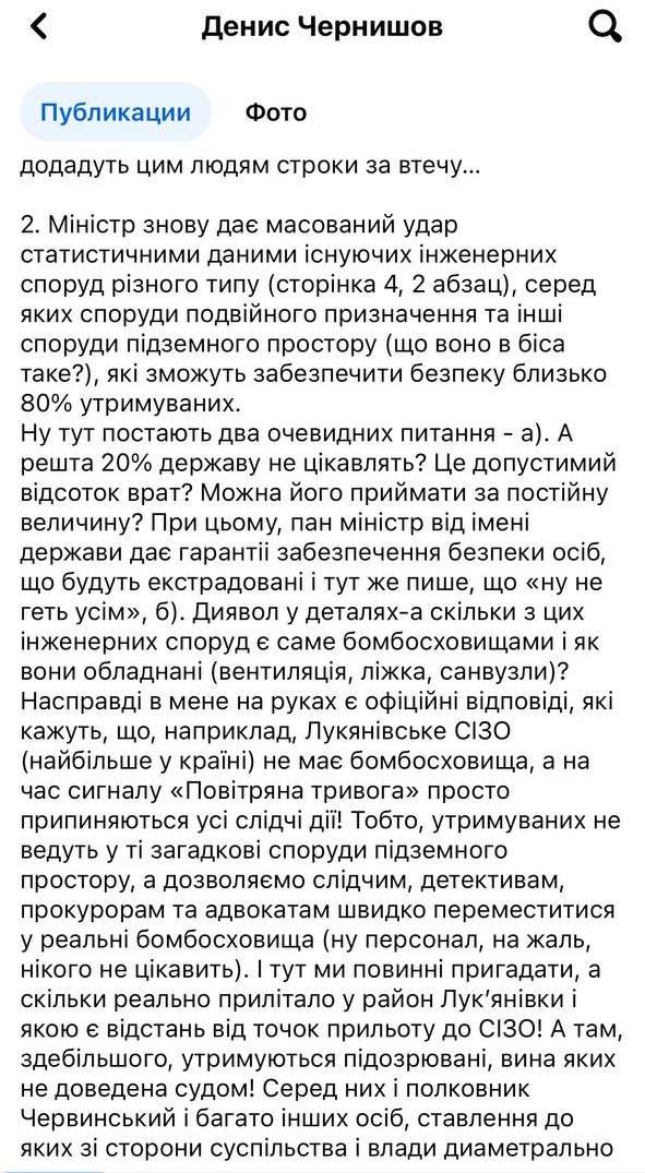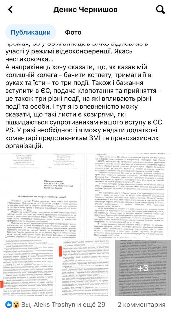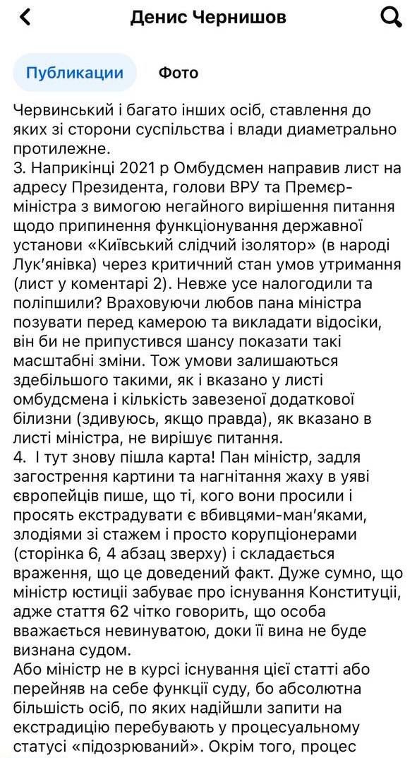 Экс-замминистра юстиции, который ранее курировал пенитенциарную систему Денис Чернышов прокомментировал это письмо на своей странице в ФБ. Он заявляет, что это письмо Малюськи является "миксом жонглирования и откровенной лжи", который "подвергает страну опасности", потому что с ней после такого международные партнеры могут не захотеть впредь общаться.