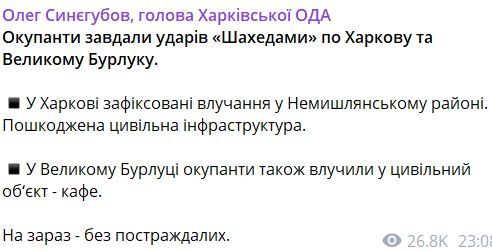 Об этом сообщил глава Харьковской областной военной администрации Олег Синегубов в своем телеграм-канале.