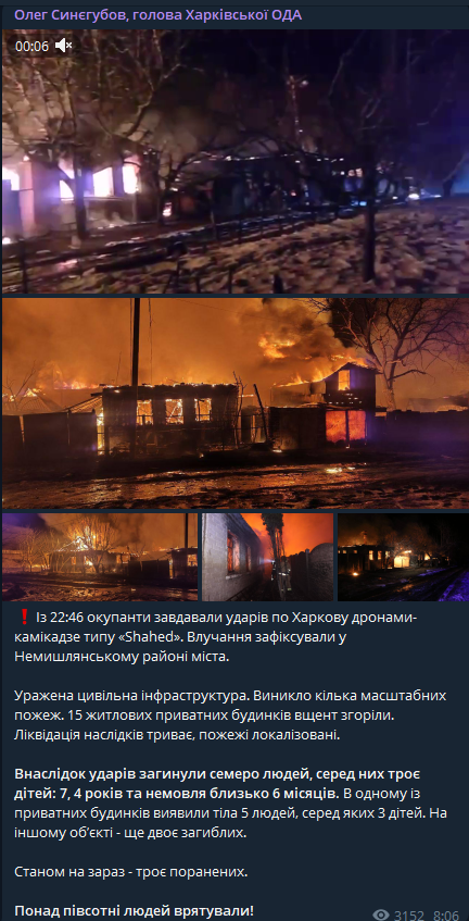 В свою очередь глава Харьковской ОВА Олег Синегубов заявил, что семь человек погибли, среди них трое детей: 7, 4 лет и ребенок около 6 месяцев.