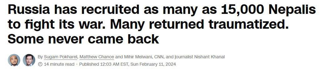 Правительство Непала заявляет, что около 200 граждан воюют на стороне РФ, и что по меньшей мере 13 непальцев были убиты в зоне боевых действий. По данным министерства иностранных дел Непала, четыре непальских боевика в настоящее время находятся Украине в качестве военнопленных. Но законодатели и правозащитники в Непале говорят, что эти цифры сильно занижены. По их данным, на стороне РФ воюют от 14 000 до 15 000 непальцев.