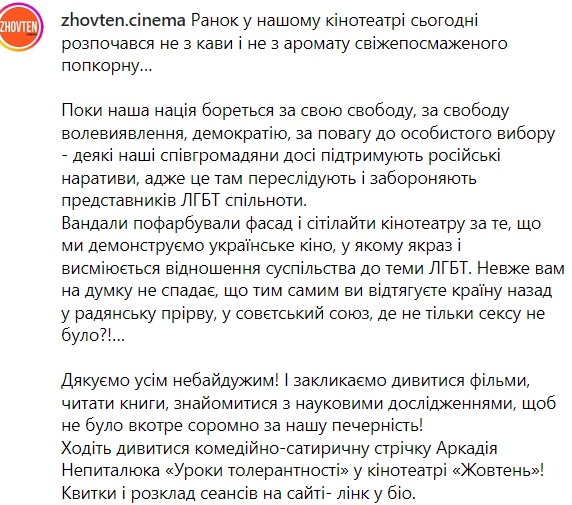Неизвестные активисты провели гомофобную акцию из-за показа фильма на тему ЛГБТ. Фото: Instagram/zhovten.cinema