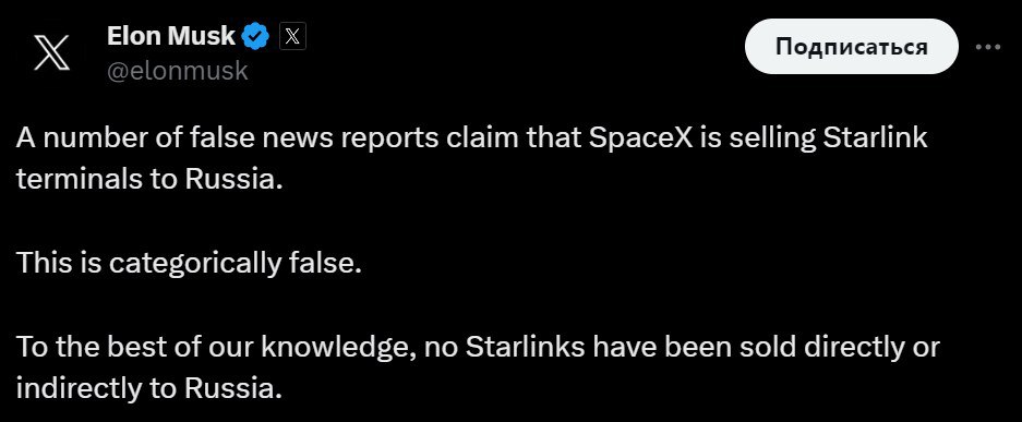 "В ряде ложных новостных сообщений утверждается, что SpaceX продает России терминалы Starlink. Это категорически неверно. Насколько нам известно, ни один Starlink не продавался прямо или косвенно в Россию", - заявил предприниматель.