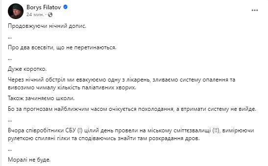 По его словам, в больнице сольют систему отопления и вывезут "немалое количество" паллиативных больных, потому что "по прогнозам в ближайшее время ожидается похолодание, а удержать систему не получится".