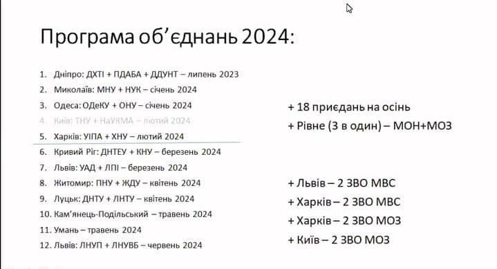 В частности, уже в 2024 году могут объединить вузы в Днепре, Николаеве, Одессе, Харькове, Кривом Роге, Львове, Житомире, Луцке, Каменец-Подольском, Ровно и Умани, как показано в таблице.
