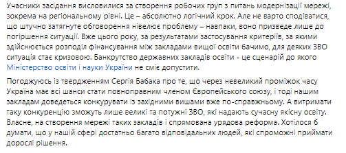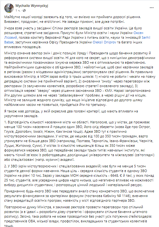 Заместитель министра образования и науки Украины Михаил Винницкий предложил в городах с населением от 100 до 350 тысяч человек оставить не более двух вузов. Он отметил, что в городах с населением до 100 тысяч нужно сохранить один вуз.