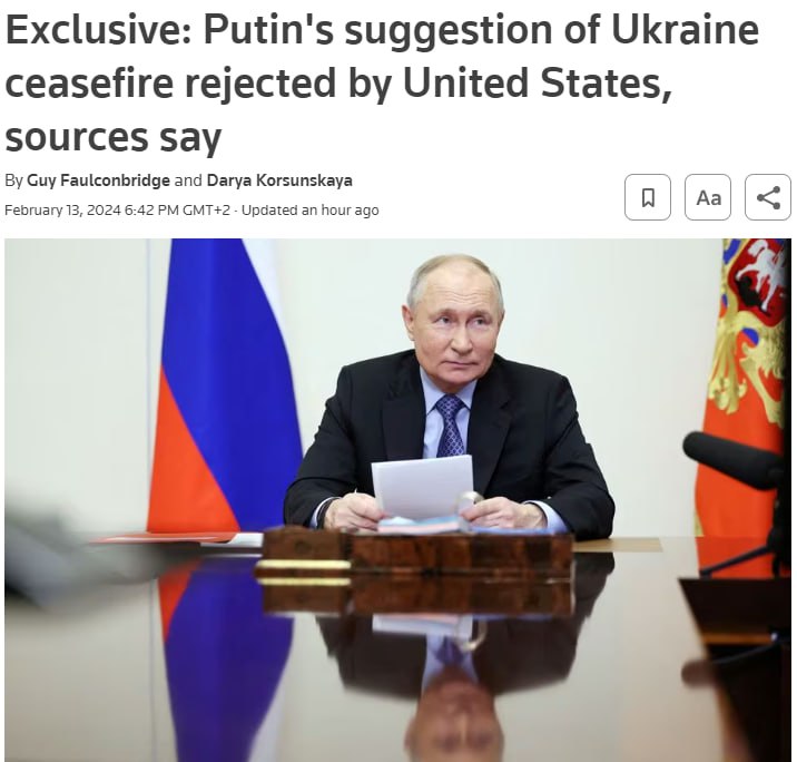 По словам российских источников, в 2023 году Путин публично и в частном порядке через посредников, в том числе через арабских партнеров Москвы на Ближнем Востоке, дал понять Вашингтону, что готов рассмотреть возможность прекращения огня в Украине. Путин предлагал заморозить конфликт на нынешних линиях и не желал уступать ни одной из украинских территорий, которые контролирует Россия, сказали собеседники агентства.