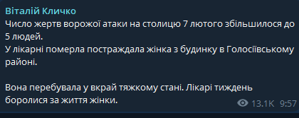 "Число жертв вражеской атаки на столицу 7 февраля увеличилось до 5 человек. В больнице скончалась пострадавшая женщина из дома в Голосеевском районе", - заявил он.