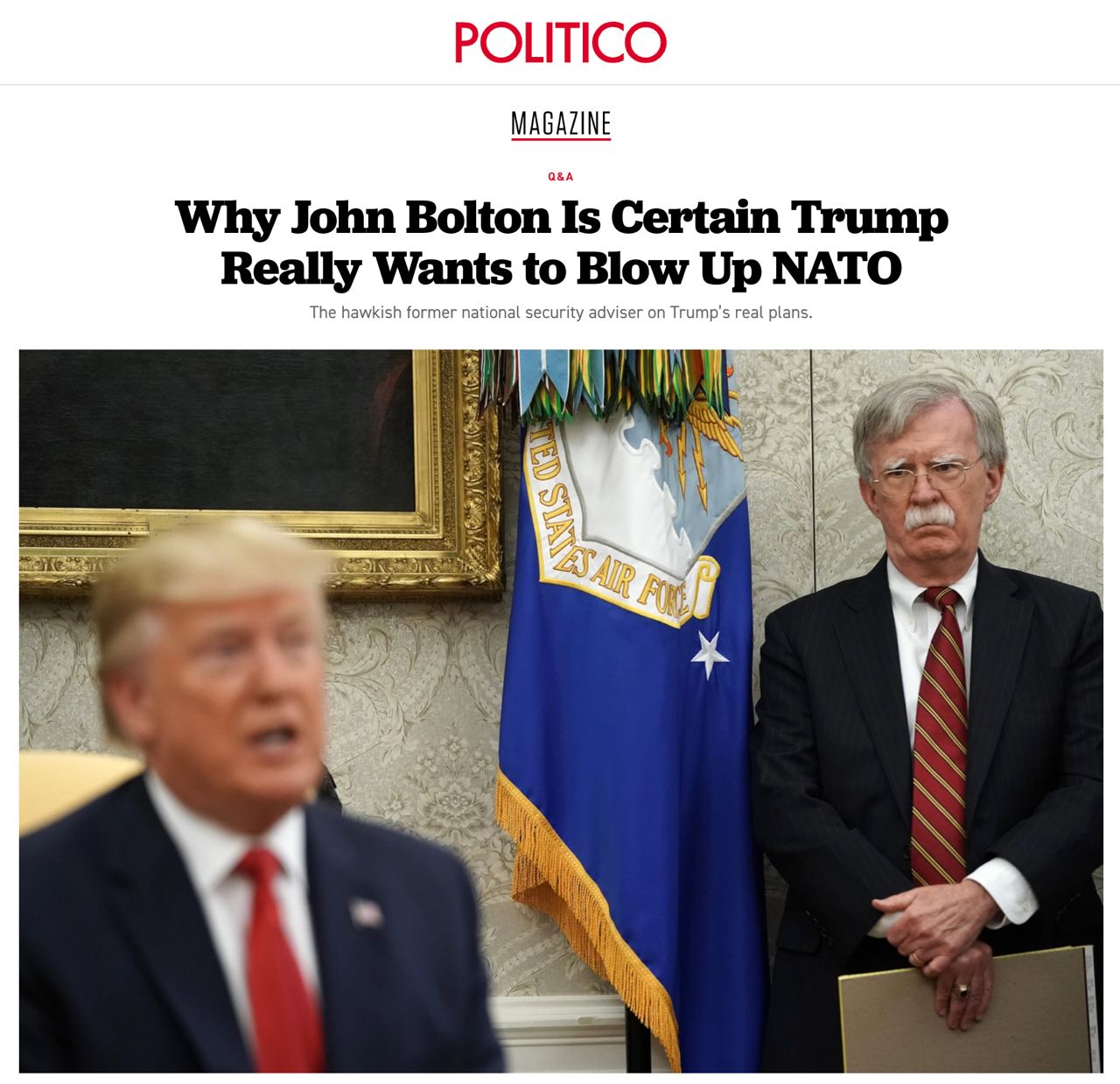 "Поэтому каждый из этих комментариев, как он делает их вот уже более шести лет, для меня просто подтверждает, что идея выхода из НАТО для него очень серьезна. Люди говорят: "Ну, он не совсем серьезен. Он ведет переговоры с НАТО". Послушайте, я был там, когда он почти вышел, и он не ведет переговоров, потому что его цель здесь не в укреплении НАТО, а в том, чтобы заложить основу для выхода", - считает Болтон.