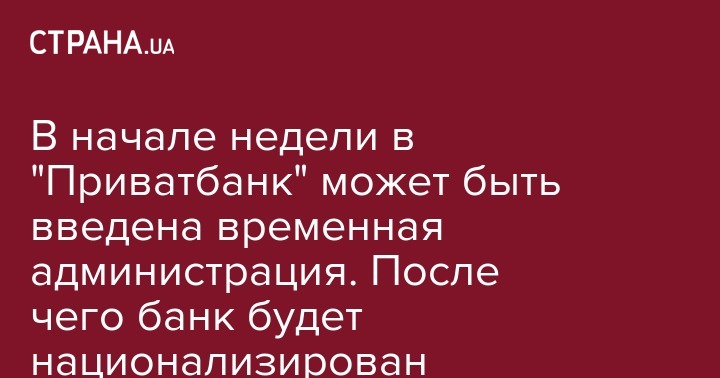 По данным источников "Страны" в Национальном банке Украины и в Фонде гарантирования вкладов, в начале следующей недели в "Приватбанке" может быть введена временная администрация. А к концу недели банк должен быть национализирован.