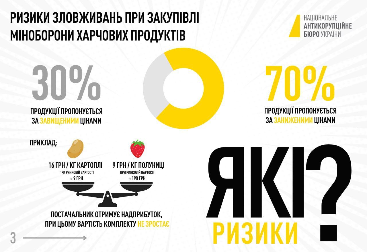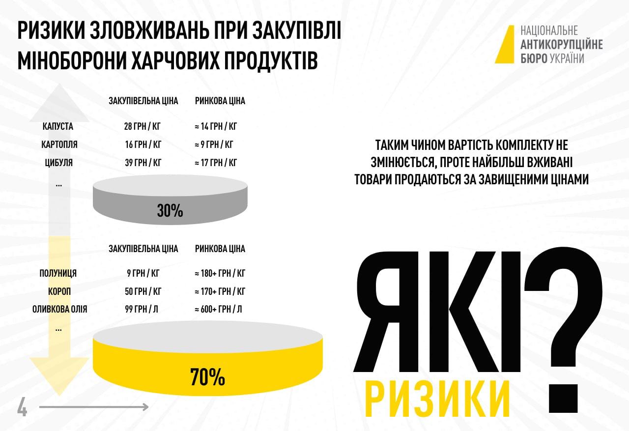 "В рамках расследования уголовного производства по закупке Министерством обороны Украины услуги по организации питания детективы Национального бюро выявили предпосылки, позволяющие значительно завышать цены на определенные категории продуктов", - говорится в сообщении.