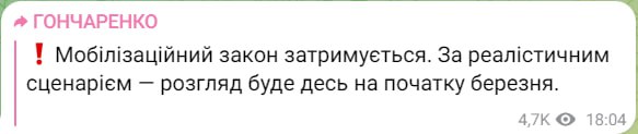 "Мобилизационный закон задерживается. По реалистическому сценарию рассмотрение будет где-то в начале марта", – написал парламентарий.