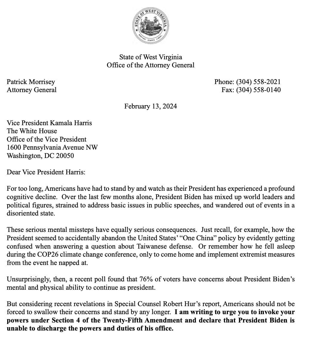 Генпрокурор Западной Вирджини Патрик Морриси призвал вице-президента Камалу Харрис признать Джо Байдена недееспособным и взять на себя обязанности президента США.