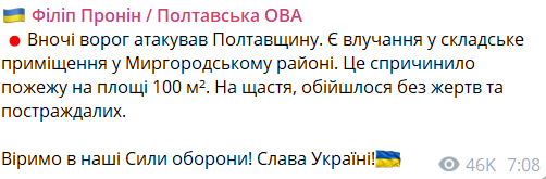 Об этом сообщил глава Полтавской областной военной администрации Филипп Пронин в своем телеграм-канале.