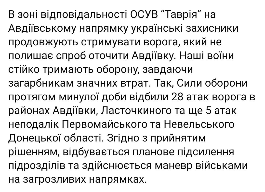 "Я подчеркиваю, что на Запорожском направлении обстановка остается стибальной. Там действительно группировка россиян сосредоточена значительная и соразмерна с Авдеевской. Но Авдеевка это узкая полоса, городская застройка, буквально несколько километров, а запорожское направление начинается от границы с Донецкой области и аж до Днепропетровской, там этот контингент российский размазан по всей линии фронта и совсем нет такой угрозы", - заявил Лиховий.