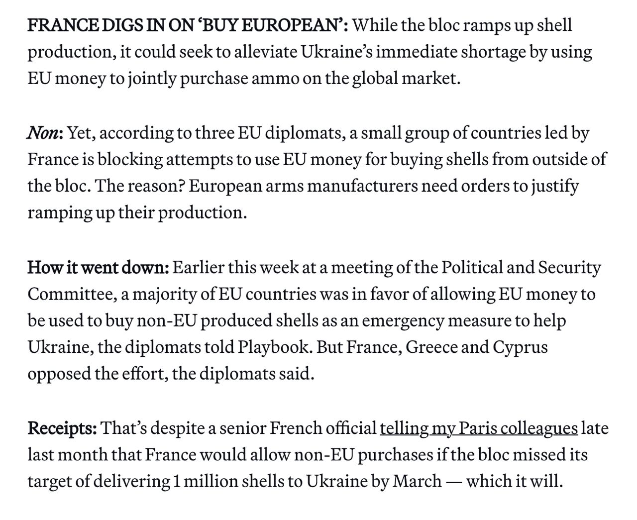 11.10 Франция блокирует закупку Европой боеприпасов для Украины на мировых рынках. Ее поддерживают Греция и Кипр.