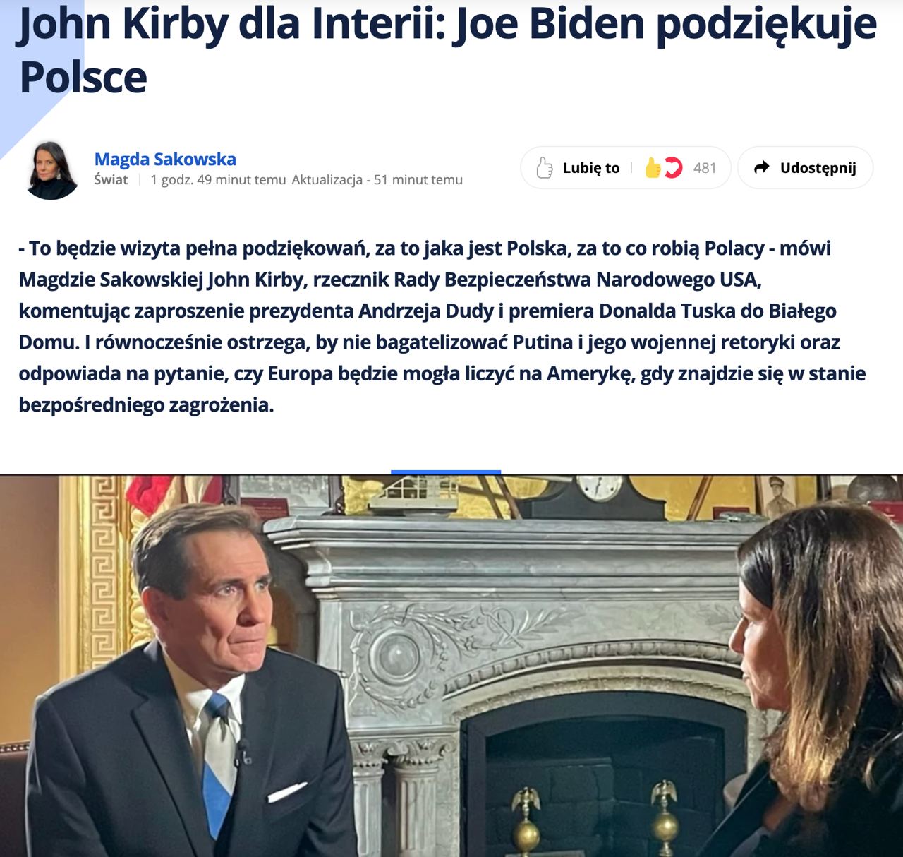 "Сейчас, конечно, Россия сосредоточена, если не сказать, в ловушке, в Украине. Мы не видим прямой угрозы НАТО, восточному флангу, не видим ее на данный момент. Однако Путин ясно дает понять, что он не хочет, чтобы НАТО было сильным или расширялось. Он одинаково ясно дает понять, что для него война, которую он ведет на Украине, — это битва России против Запада, или что это битва Соединенных Штатов против России, или даже России против НАТО", - заявил Кирби в интервью польскому изданию Interia.