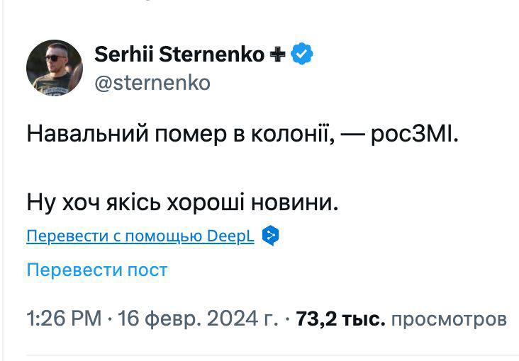 "Навальный умер в колонии - росСМИ. Ну хоть какие-то хорошие новости", - написал Стерненко в соцсети Х.