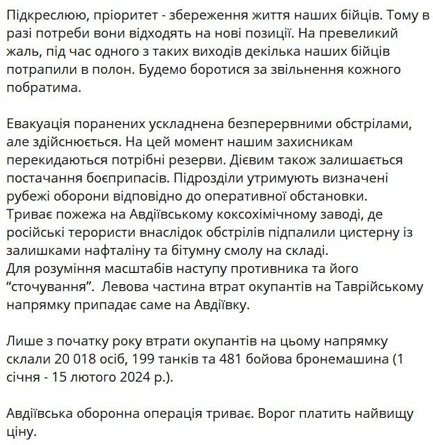 "С разрушенных позиций украинские воины выходят маневром и закрепляются на новых рубежах обороны. При необходимости они отходят на новые позиции. К сожалению, во время одного из таких выходов несколько наших бойцов попали в плен", – написал он.