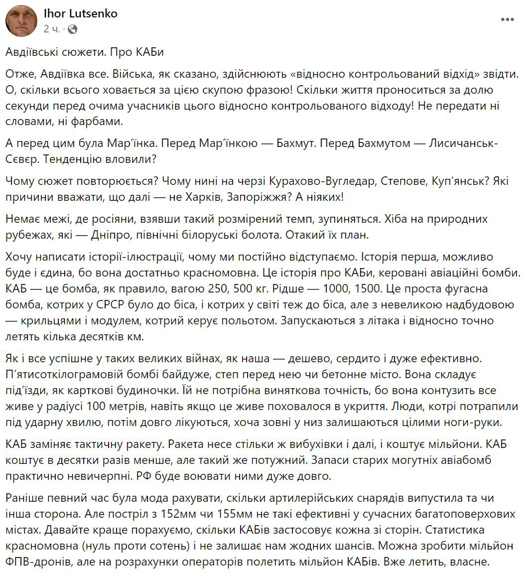 Луценко говорит, что КАБы гораздо дешевле ракет, обладая той же разрушительной силой и относительной точностью. Он также отмечает, что Украина не применяет западные аналогичные бомбы, поскольку ее авиация не может подниматься на нужную высоту.