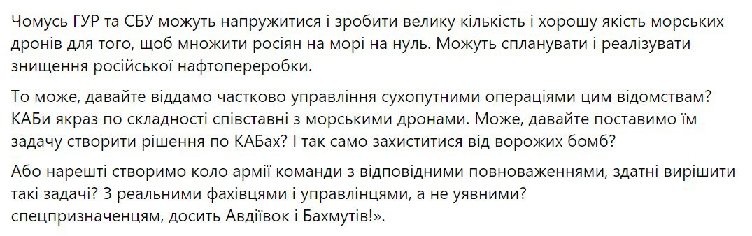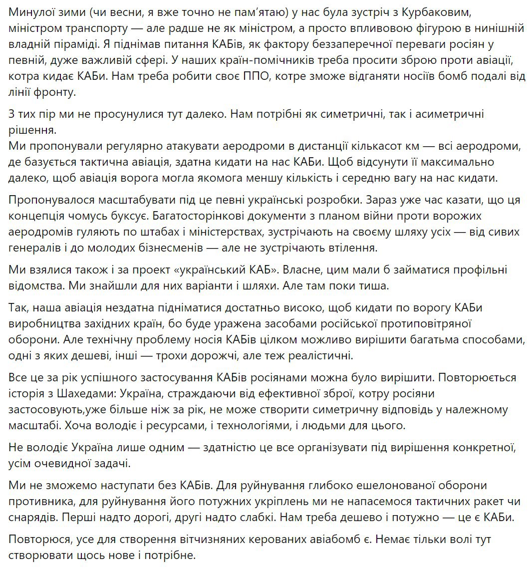 "Можно сделать миллион FPV-дронов, но на расчеты операторов улетит миллион КАБов. Уже летит собственно" - заявил он.