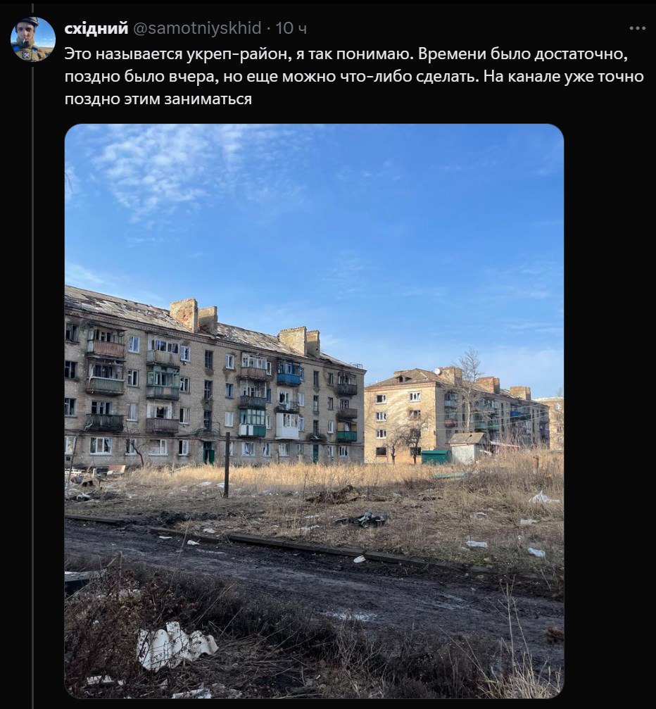 "Я далеко не эксперт в стратегии, но Часик точная копия Бахмута по подготовке к обороне в плане оборонительных сооружений, блиндажей, окопов - точнее их отсутствии. Пока враг вкапывается и заливается бетоном, минируя каждый куст, мы снова надеемся на фортецю из нескольких 4-х и 2-х этажек", - написал он.