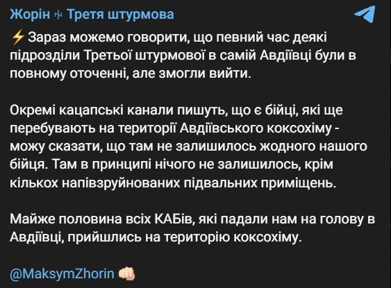 "Отдельные кацапские каналы пишут, что есть бойцы, еще находящиеся на территории Авдеевского коксохима - могу сказать, что там не осталось ни одного нашего бойца. Там в принципе ничего не осталось, кроме нескольких полуразрушенных подвальных помещений", - написал Жорин.