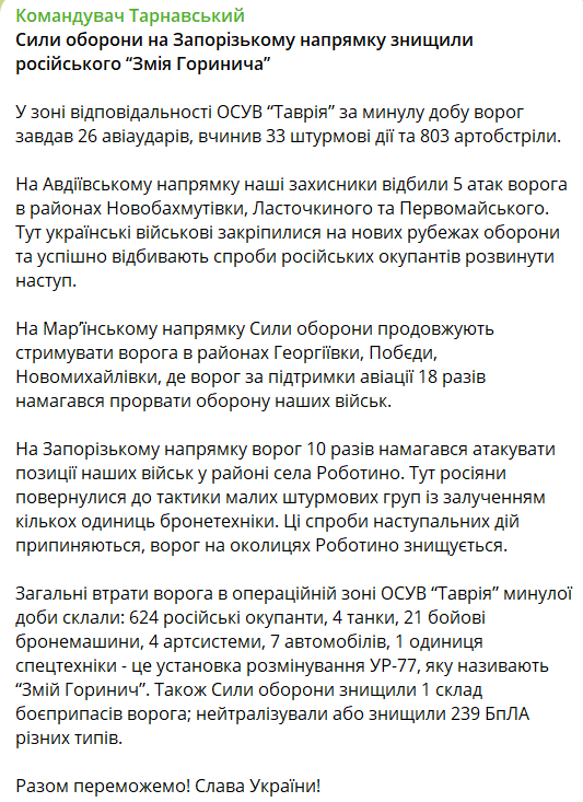 Накануне Силы обороны сообщили, что украинские войска отбили наступление россиян на Запорожском направлении.
