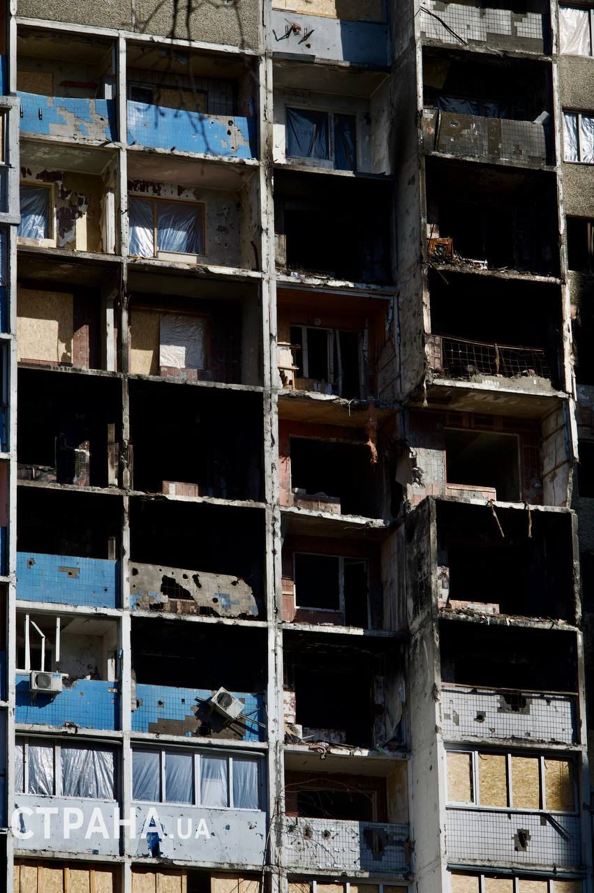 В 18-этажном доме на столичных Теремках, который пострадал во время ракетной атаки 7 февраля, повреждены два подъезда, сейчас в них нет электричества, воды и отопления.