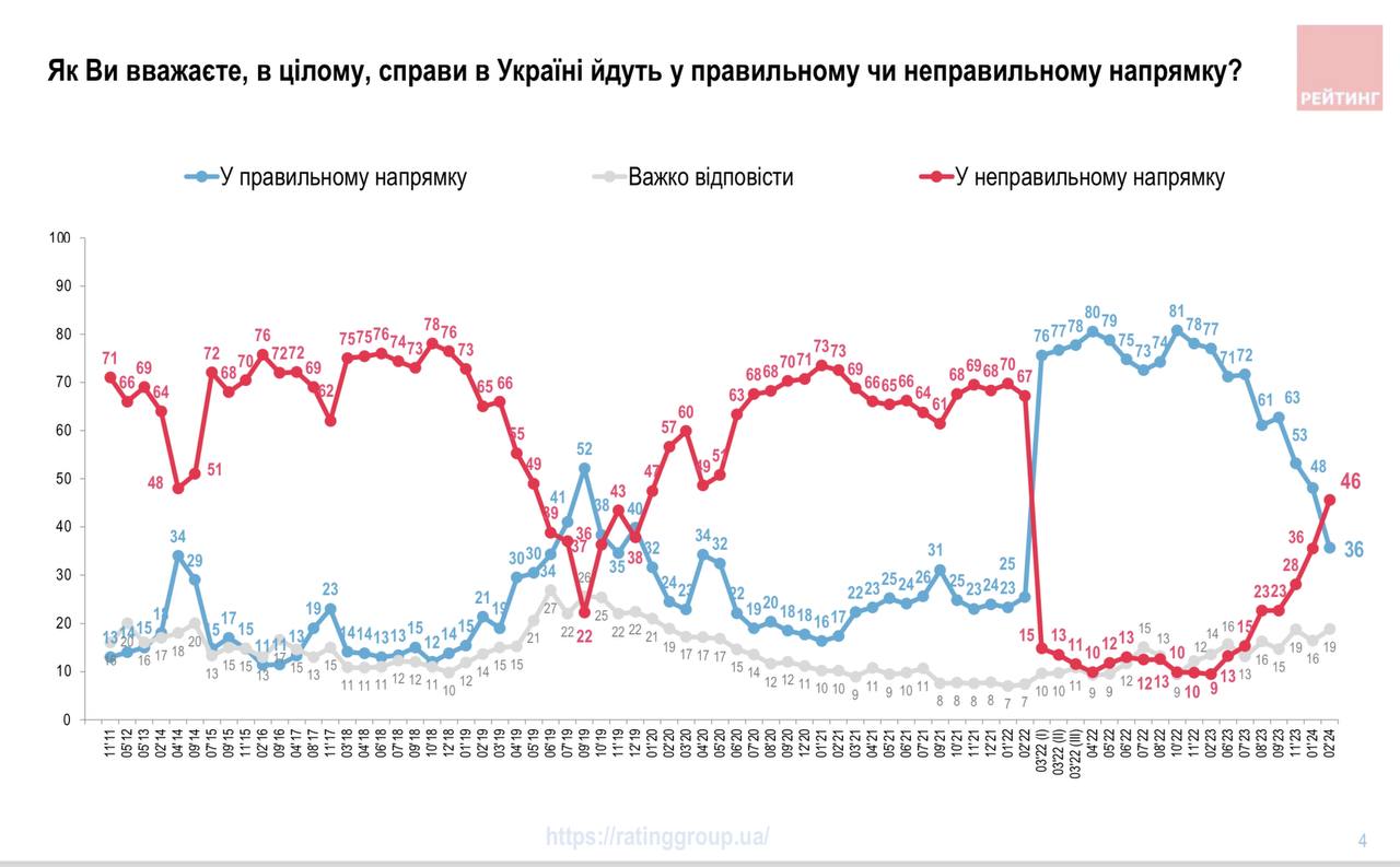 Неправильным направление движения страны в феврале считают 46% опрошенных, правильным - 36% (остальные не определились), в то время как в январе эти цифры составляли 48% и 36% в пользу "правильного направления".