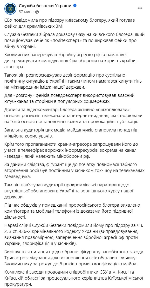 Служба безопасности Украины сообщила о подозрении киевскому блогеру и политэксперту.