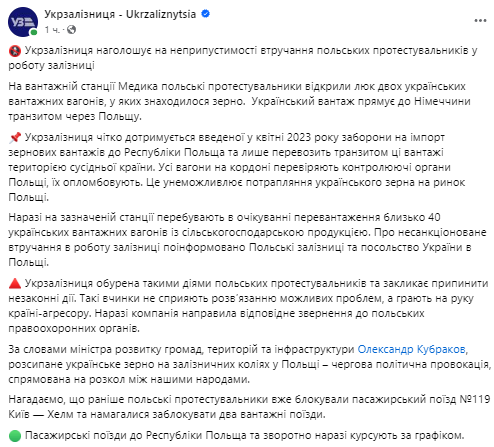 УЗ отмечает, что в Польшу зерно Украина не возит в соответствии с решением от апреля 2023, а только транзитом в другие страны.