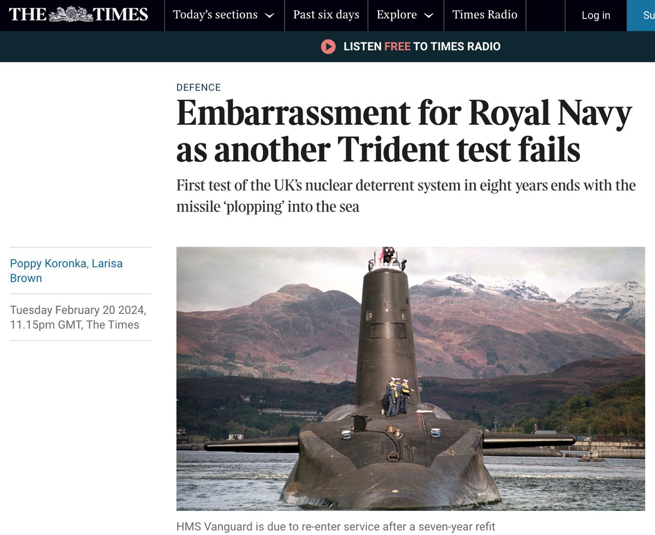 Во время учений в Атлантическом океане британская подводная лодка HMS Vanguard выпустила трехступенчатую баллистическую ракету Trident 2. Согласно сообщениям, снаряд приземлился всего в нескольких ярдах от самой подлодки, где находились глава Министерства обороны Британии и адмирал.