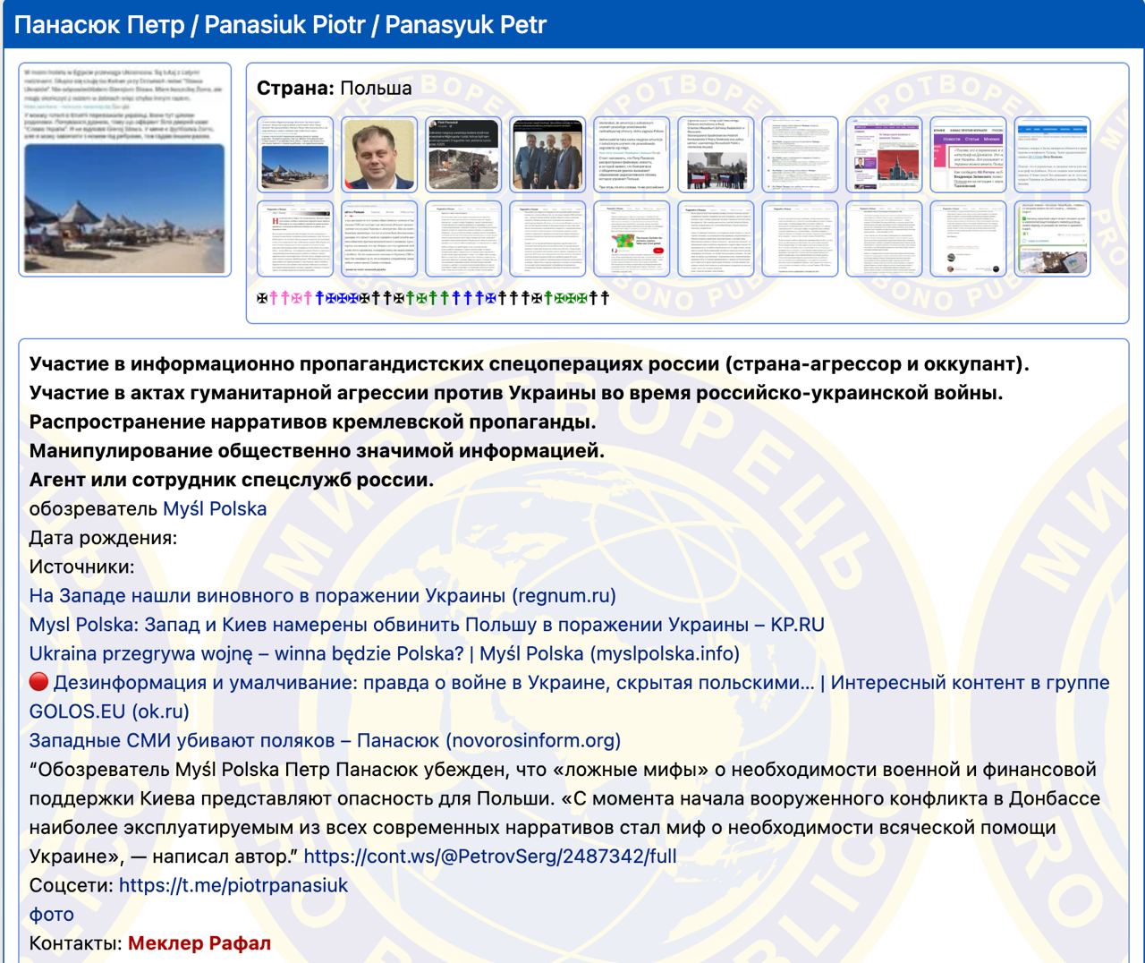 Также указано, что он "агент или сотрудник спецслужб россии". А также обозреватель издания Myśl Polska.