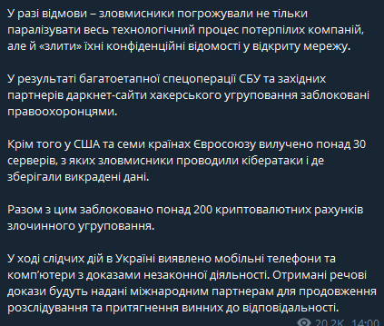 В результате многоэтапной спецоперации СБУ и западных партнеров даркнет-сайты хакерской группировки заблокированы правоохранителями. Кроме того, в США и семи странах Евросоюза изъято более 30 серверов, из которых злоумышленники проводили кибератаки и где хранили похищенные данные. При этом заблокировано более 200 криптовалютных счетов преступной группировки.