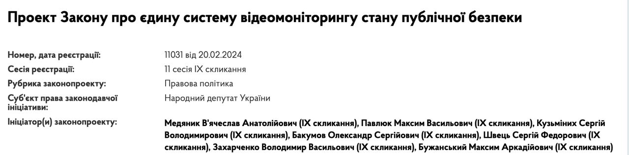 Зарегистрирован соответствующий законопроект "О единой системе видеомониторинга состояния публичной безопасности".