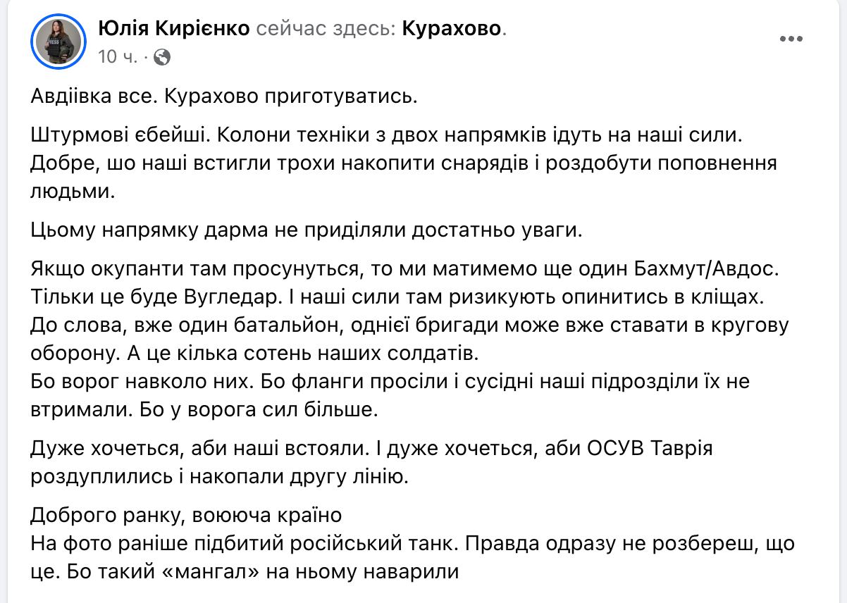 "Штурмовые е@ейшие. Колонны техники с двух направлений идут на наши силы. Хорошо, что наши успели немного накопить снарядов и раздобыть пополнение людьми. Этому направлению зря не уделяли достаточно внимания. Если оккупанты там продвинутся, то мы будем иметь еще один Бахмут/Авдос. Только это будет Угледар", - пишет Кириенко.