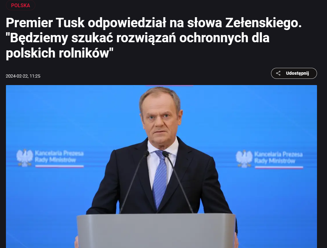 Он призвал разделить оба вопроса во внутреннем и международном обсуждении: безоговорочную поддержку Украины и защиту польских фермеров и польского рынка от негативных последствий либерализации торговли с Украиной.