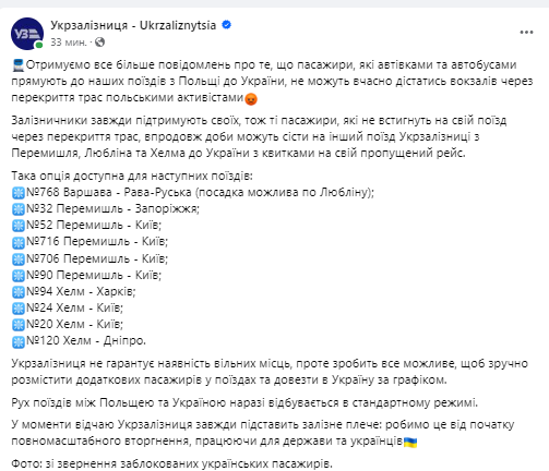 В компании отметили, что "те пассажиры, которые не успеют на свой поезд из-за перекрытия трасс, в течение суток могут сесть на другой поезд "Укрзализныци" из Перемышля, Люблина и Хелма в Украину с билетами на свой пропущенный рейс".